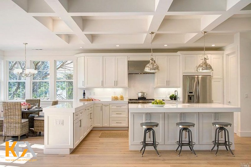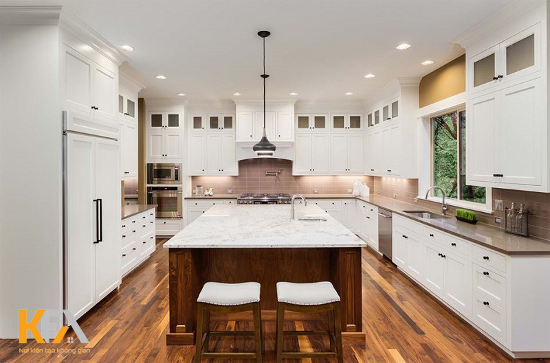 Phòng bếp phong cách nội thất tân cổ điển thường được tập trung lựa chọn vật liệu, chất liệu thiết kế và các vật dụng nội thất. Các chất liệu vật liệu phòng bếp được sử dụng khá cao cấp như đá hoa cương, gỗ,… giúp mang đến vẻ đẹp hài hòa cho tổng thể căn nhà.