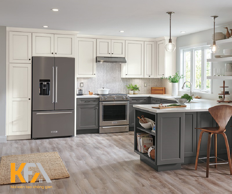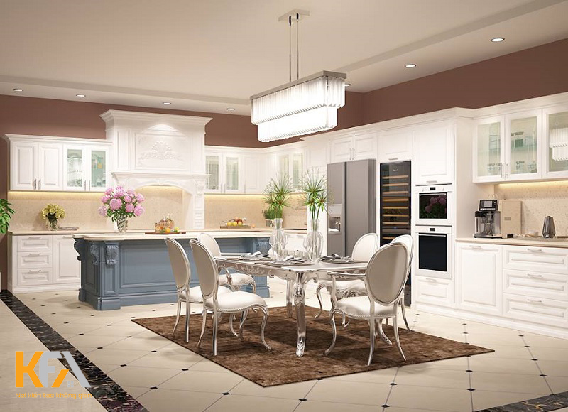 Ngoài ra, các đồ nội thất phòng bếp như tủ bếp, kệ bếp, kệ chén bát, bàn ăn,… thường được nhấn nhá bằng nhiều họa tiết hoặc là sử dụng chất liệu sang trọng, quý phái.