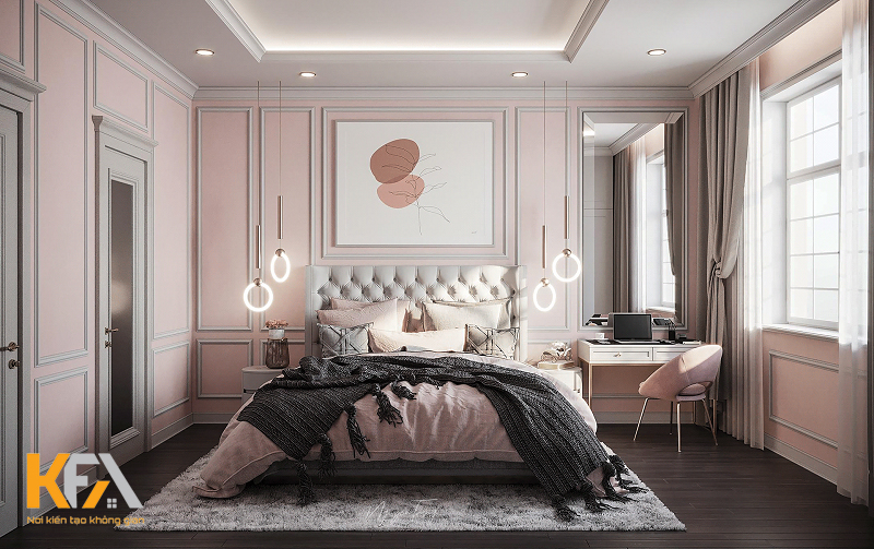 Căn phòng màu hồng này là ý tưởng thiết kế nội thất phòng ngủ tân cổ điển nhẹ nhàng tinh tế cực phù hợp với vợ chồng mới cưới. Màu hồng pastel điểm thêm những đường gờ chỉ màu xám mang lại cảm giác ấm áp và những chiếc đèn trang trí lung linh hay chiếc rèm cửa 2 lớp… Tất cả được kết hợp với nhau một cách ăn ý nhất.