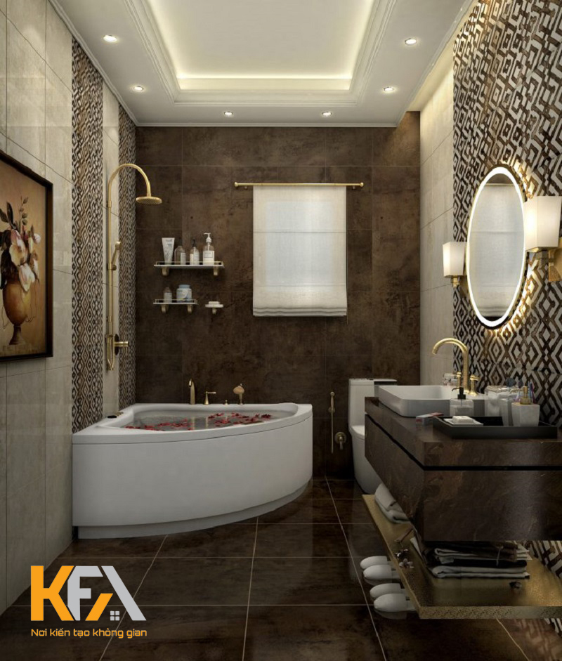 Phòng tắm sử dụng gỗ nâu vàng giúp gia tăng độ ấm cúng. Ngoài ra, gam màu này còn toát lên vẻ đẹp xa hoa, quý tộc và thể hiện sự bề thế của gia chủ.