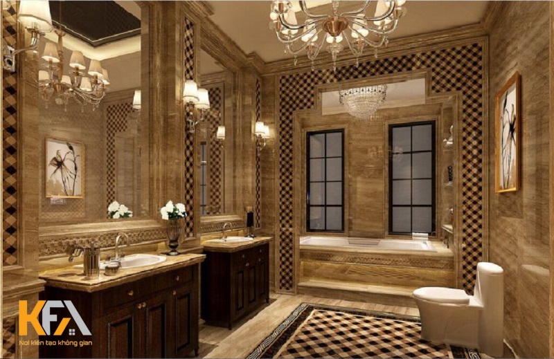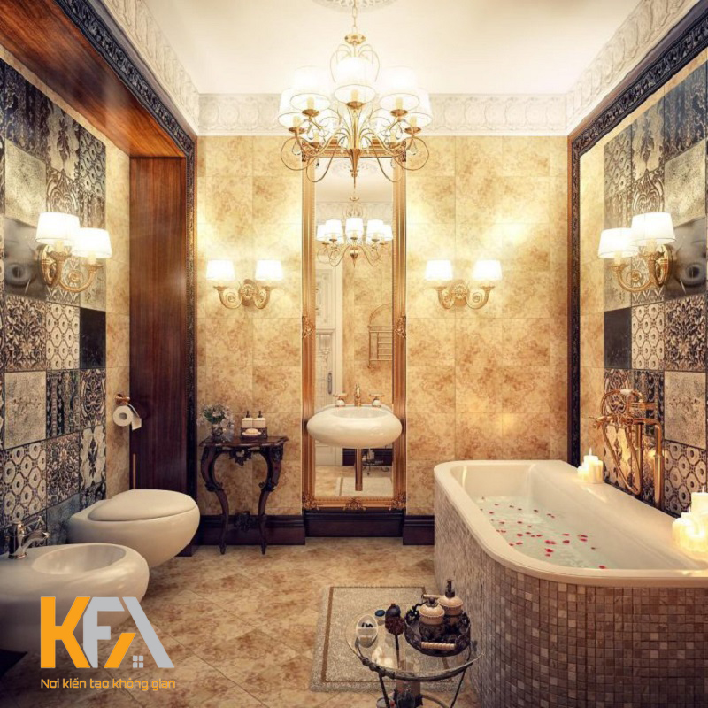 Với thiết kế tân cổ điển thì nội thất phòng tắm cũng khá được chú trọng. Phòng tắm thường được sử dụng với tông màu sáng nhẹ nhàng kết hợp với các đường nét mềm mại, hạn chế sự khô cứng. Đặc biệt, trong phòng tắm tân cổ điển, phòng tắm được bài trí khoa học, gọn gàng nhưng vẫn đảm bảo được vẻ đẹp quý phái, hiện đại.