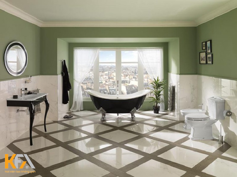 Mẫu nhà tắm này thể hiện rõ nét phong cách tân cổ điển thông qua hai màu đen và xanh kết hợp họa tiết sọc trên sàn nhà.